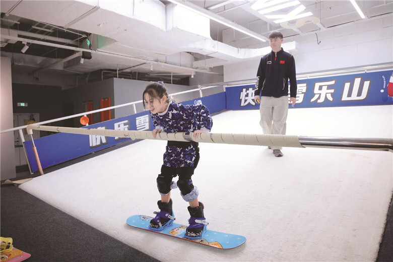 長春新區中商·世界雪樂山室內滑雪館的教練利用模擬器對小學員進行“一對一”指導。